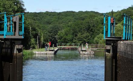 Patureau lock viewed ahead with top gates manned and opened.