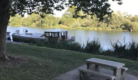 Quiet parkland mooring on RB at PK26 with picnic tables near steep cliffs