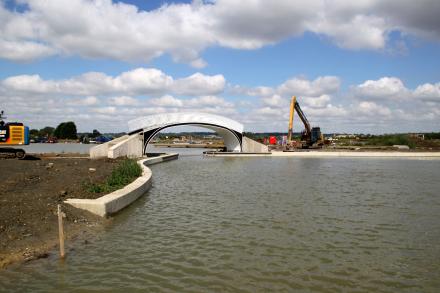 The newly opened marina entrance - though at this point much development remained in progress, the bridge approaches were incomplete and the towpath was still diverted.