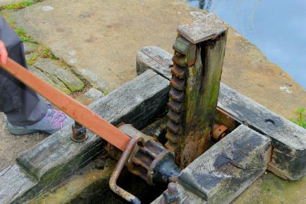 With this arrangement, you turn the spindle about a quarter of a turn, take it out, do it again... At least the teeth are quite large, and apparently it's OK just to drop the paddle to close it. This one's a ground paddle, though you find them on gates too.