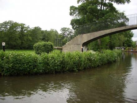 After some tight corners the Quarry Hill Footbridge comes into view. Note the roller on the left of the image, used to help horse boats around the corner.