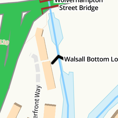 Travel to Walsall Junction, then on the Birmingham Canal Navigations (Walsall Canal) to Walsall Town Wharf