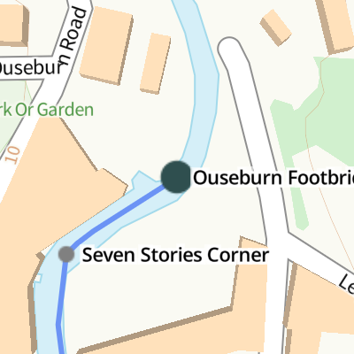 Ouseburn Footbridge is a minor waterways place at the end of the River Ouseburn; past Tyne - Ouseburn Junction (Junction of the River Tyne and the River Ouseburn ) (3 furlongs and 2 locks to the southeast).